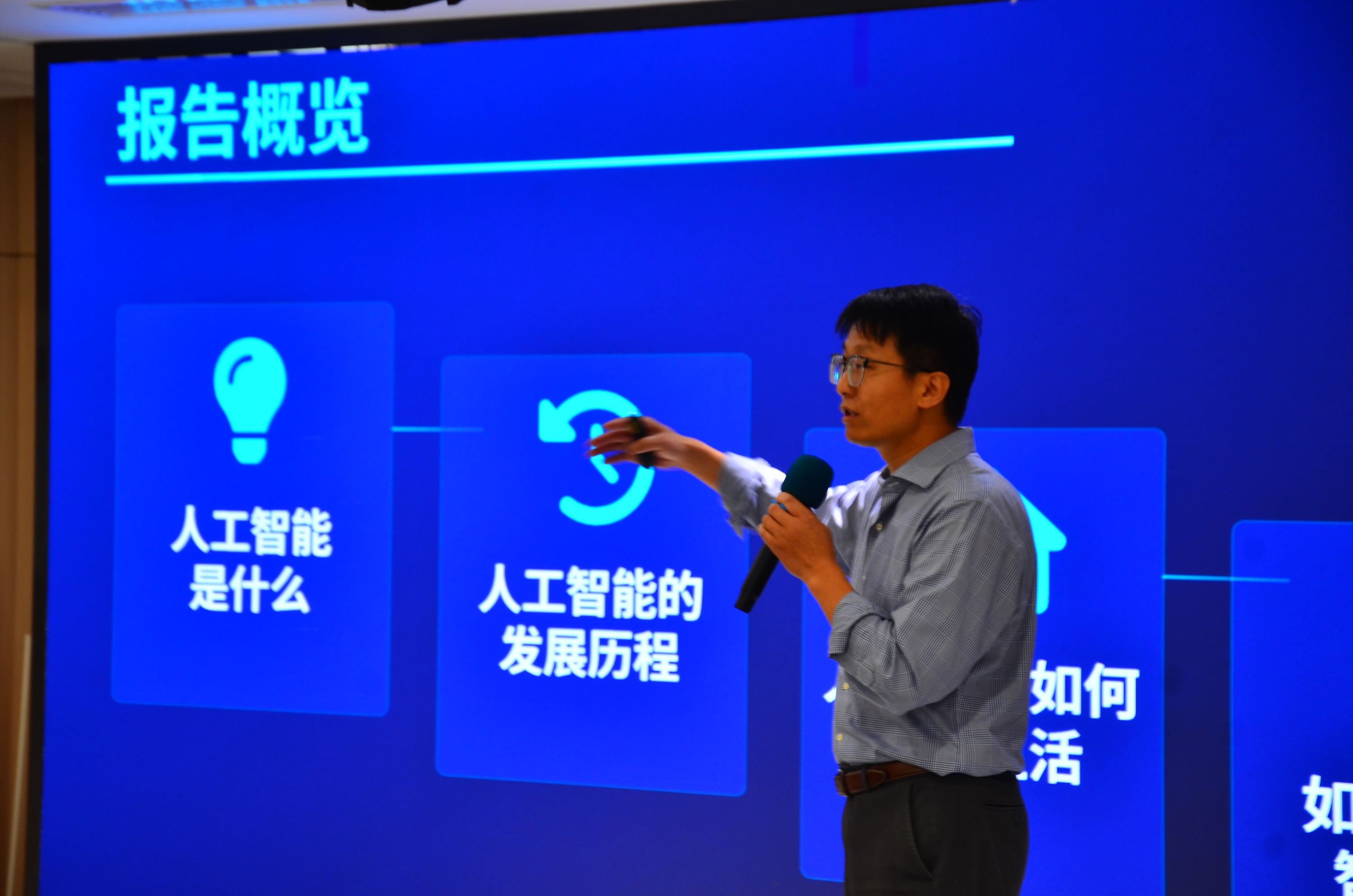 首先,上海交通大学中英国际低碳学院副教授任涛为老年学员们带来了“人工智能:从想象到现实的奇妙之旅”主题讲座。任教授用通俗易懂的语言,结合生活实例,围绕人工智能是什么、人工智能的发展历程、人工智能如何改变生活、以及我们如何于人工智能相处和学员们做交流和分享。考虑到老年学员的特点,课程特别设置了充足的互动环节,确保每位学员都能跟上课程节奏,充分理解授课内容。