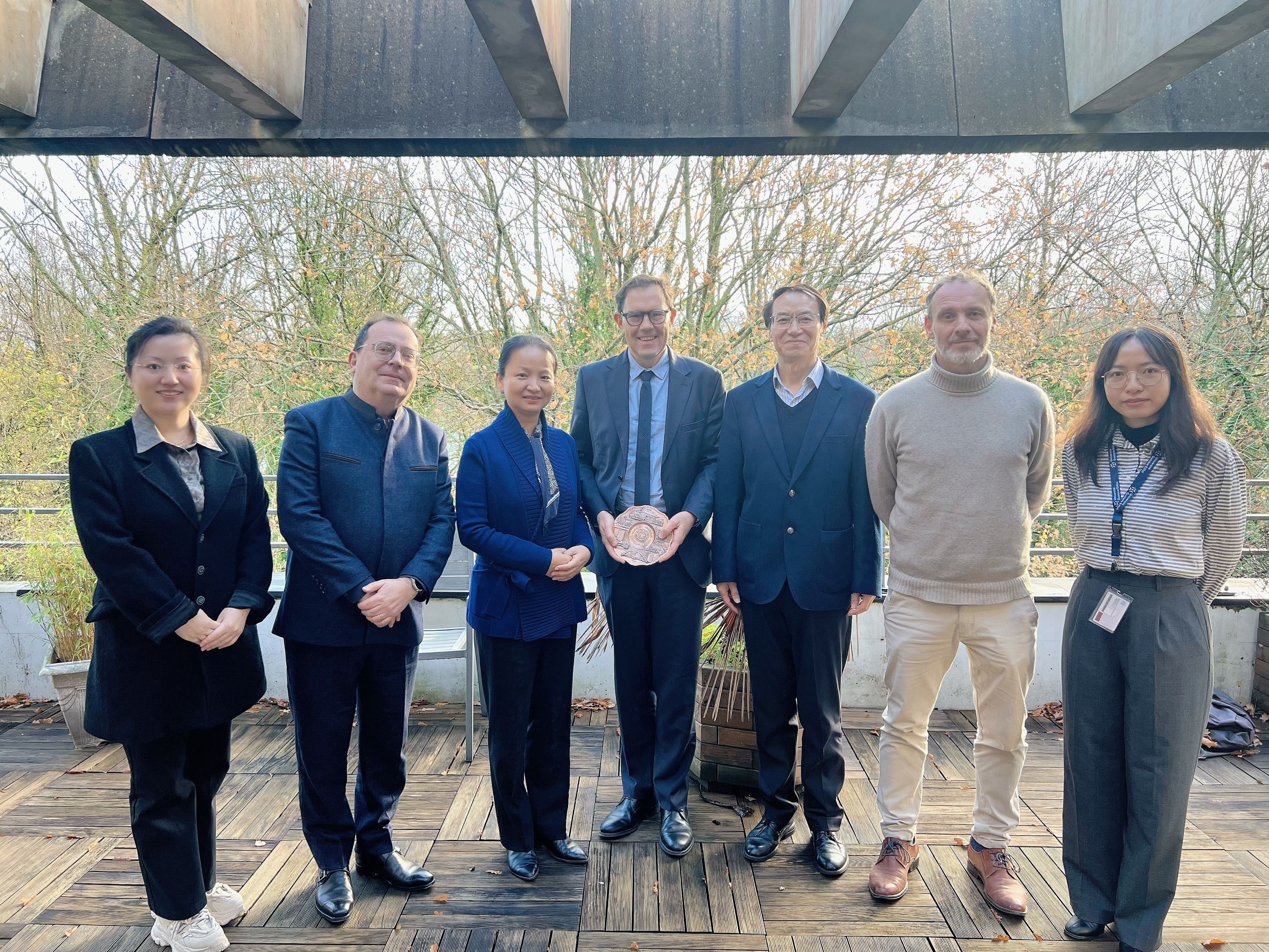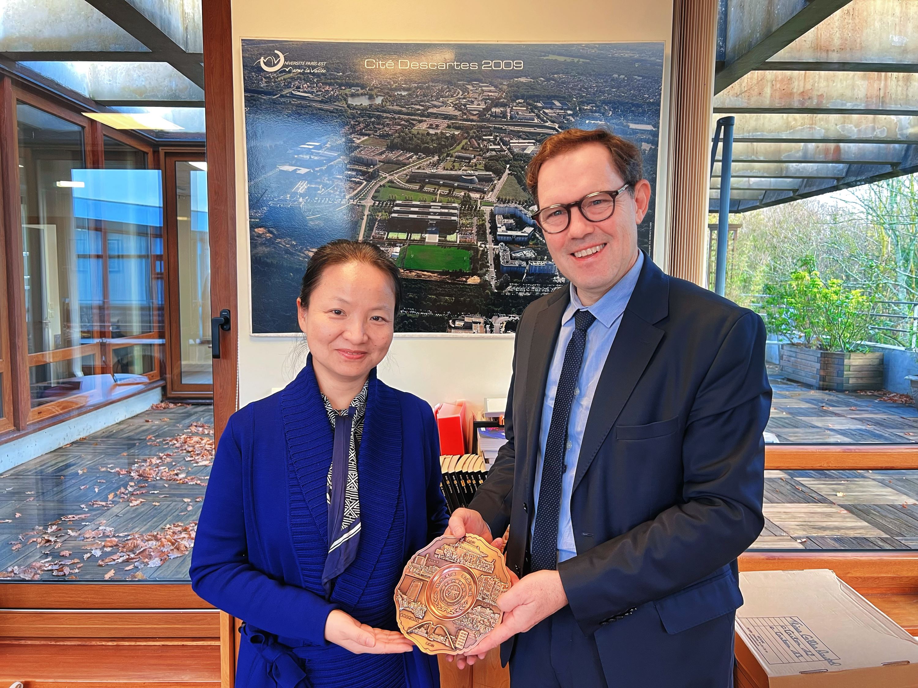 11月24日,代表团访问法国古斯塔夫·埃菲尔大学,与校长Gilles ROUSSEL举行工作会谈。双方分享了各自的办学特色和重点研究领域,计划从科研实习和学生交流项目开始拓展合作,法方拟于明年春季派校长团来访并签订校级合作协议。古斯塔夫·埃菲尔大学是法国以城市可持续转型研究为核心的多学科公立大学,2020年由六所高等院校合并成立,在可持续城市领域代表法国四分之一的研究力量。