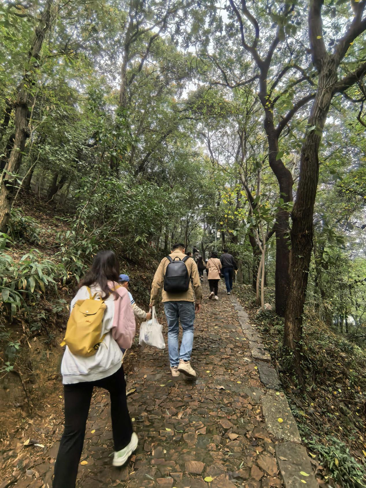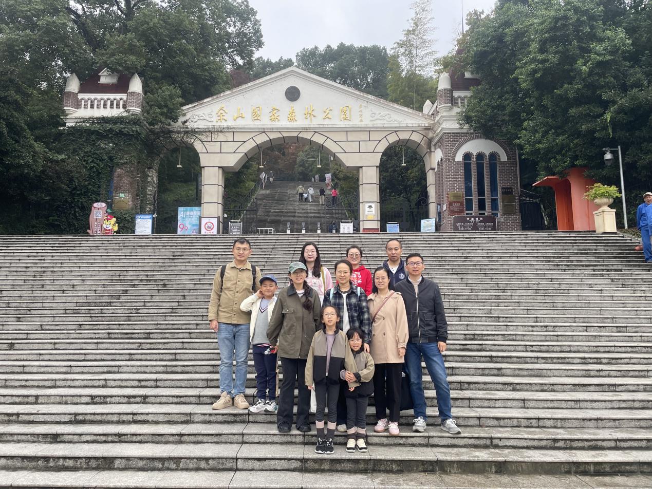 上午九时许,队伍抵达佘山脚下的登山起点。佘山虽不高峻,但秋意正浓,层林尽染,正是登高望远的绝佳时节。教职工和“交小苗”们三两成群,拾级而上,在相互扶持与鼓励中向山顶进发。沿途枫林如火,银杏铺金,大家不时驻足拍摄,用镜头定格下“影”你而来的美好瞬间。经过半小时的攀登,全体人员顺利抵达佘山之巅——著名的佘山天主大教堂。在教堂观景平台上,大家俯瞰松江全貌,浦江秋色尽收眼底,远处广富林文化遗址的青瓦屋顶若隐若现。山风拂面,红叶飘零,人与自然在这片诗意的空间中融为一体,许多教职工纷纷表示,平日科研教学的疲惫在这一刻得到了彻底的释放。
